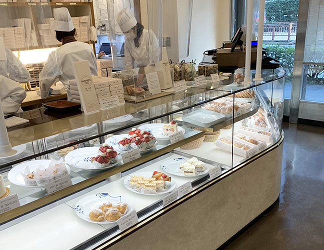 新橋のお店につきますと、平日の昼なのに、行列です。それも、サラリーマンの方々が多いです。取引先に持っていく手土産にちょうどいいサイズ。やはり、「レイズン・ウィッチ」を求めるお客さんが多いようです。でも、ショーケースには美味しそうなケーキが並んでいますね!名店がつくるシュークリーム、期待値もあがります。